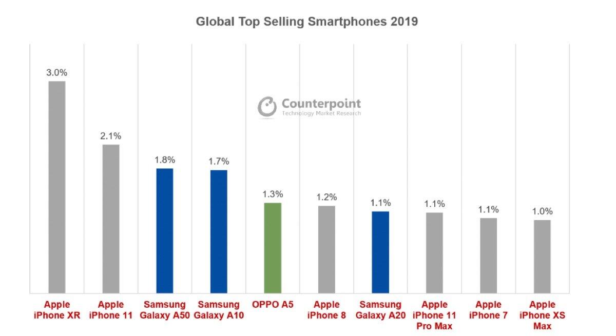 In den Top 10 von 2019 findet man jedoch sechsmal ein iPhone von Apple und drei Galaxy-Modelle von Samsung. Nur Oppo konnte sich mit dem A5 den fünften Platz sichern, das Modell war laut Counterpoint Research das meistverkaufte Gerät in China und der APAC-Region. Doch Apple und Samsung dominieren.