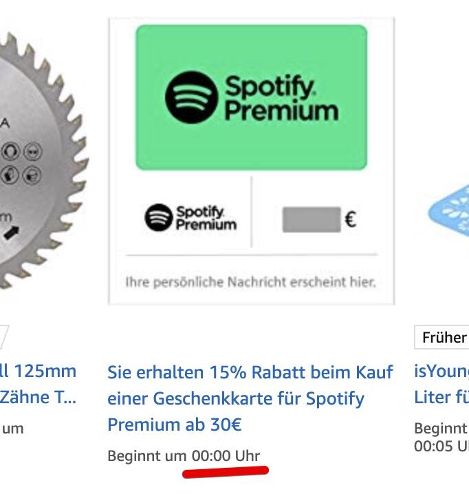 Auf der Angebote-Seite teasert man die Rabattaktion bereits an. Dort heißt es aktuell: „Sie erhalten 15 % Rabatt beim Kauf einer Geschenkkarte für Spotify Premium ab 30€“. Erworben werden kann das reduzierte Guthaben ab Mitternacht auf dieser Seite.