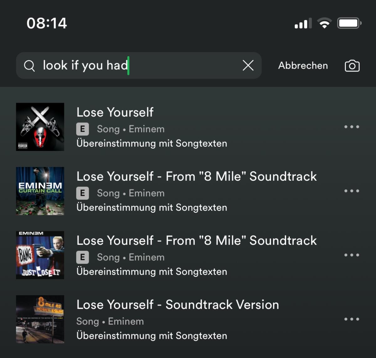 Das Problem mit der Suche: Ich habe auch immer mal wieder einen kleinen Fehler in den Text eingebaut und Spotify konnte mir dann keine Songs anzeigen. Google ist da dank jahrelanger Erfahrung schlauer und lieferte mir diese Ergebnisse.
