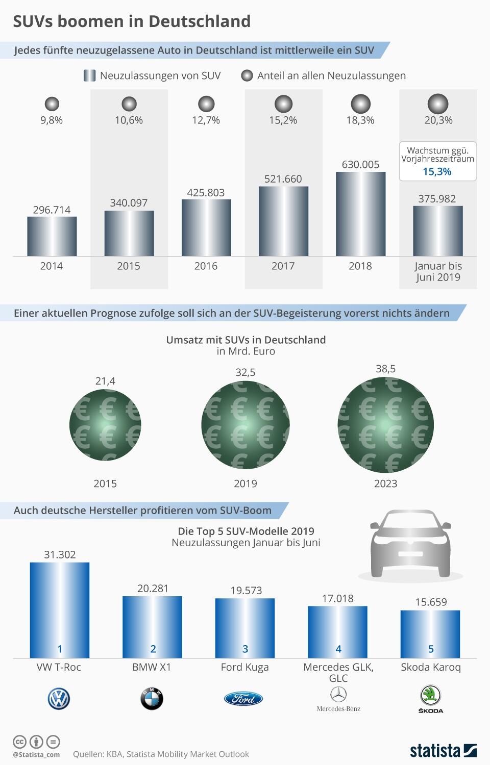Während der Anteil bei den Neuzulassungen im letzten Jahr bei 18,3 Prozent lag, so werden wir 2019 wohl die 20 Prozent knacken. Der Umsatz wird wohl die 30 Milliarden Euro in Deutschland überschreiten und das führende Modell ist der VW T-Roc, der 2019 schon über 30.000 Mal verkauft wurde.