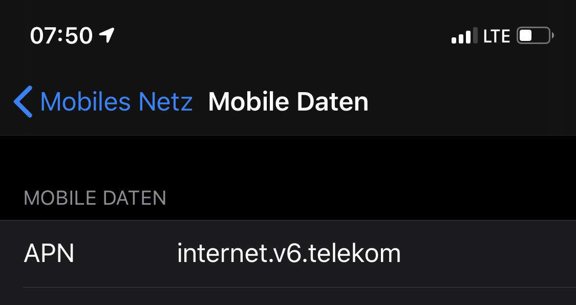 Wer im Telekom-Netz unterwegs (egal bei welchem Anbieter) ist und daran Interesse hat, kann bereits jetzt an seinem Smartphone einen IPv6-only Zugang konfigurieren. Dafür müsst ihr den folgenden APN einrichten: