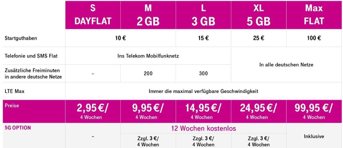 Ab dem Telekom-Prepaid-Tarif M wird man den 5G-Zugang als Option anzubieten. Dieser kann vom Kunden auf Wunsch gebucht werden. Wer über das nötige Endgerät verfügt, kann an ersten Orten nicht nur mit 5G surfen, sondern die ersten 12 Wochen ohne Aufpreis die neue Mobilfunktechnik nutzen.