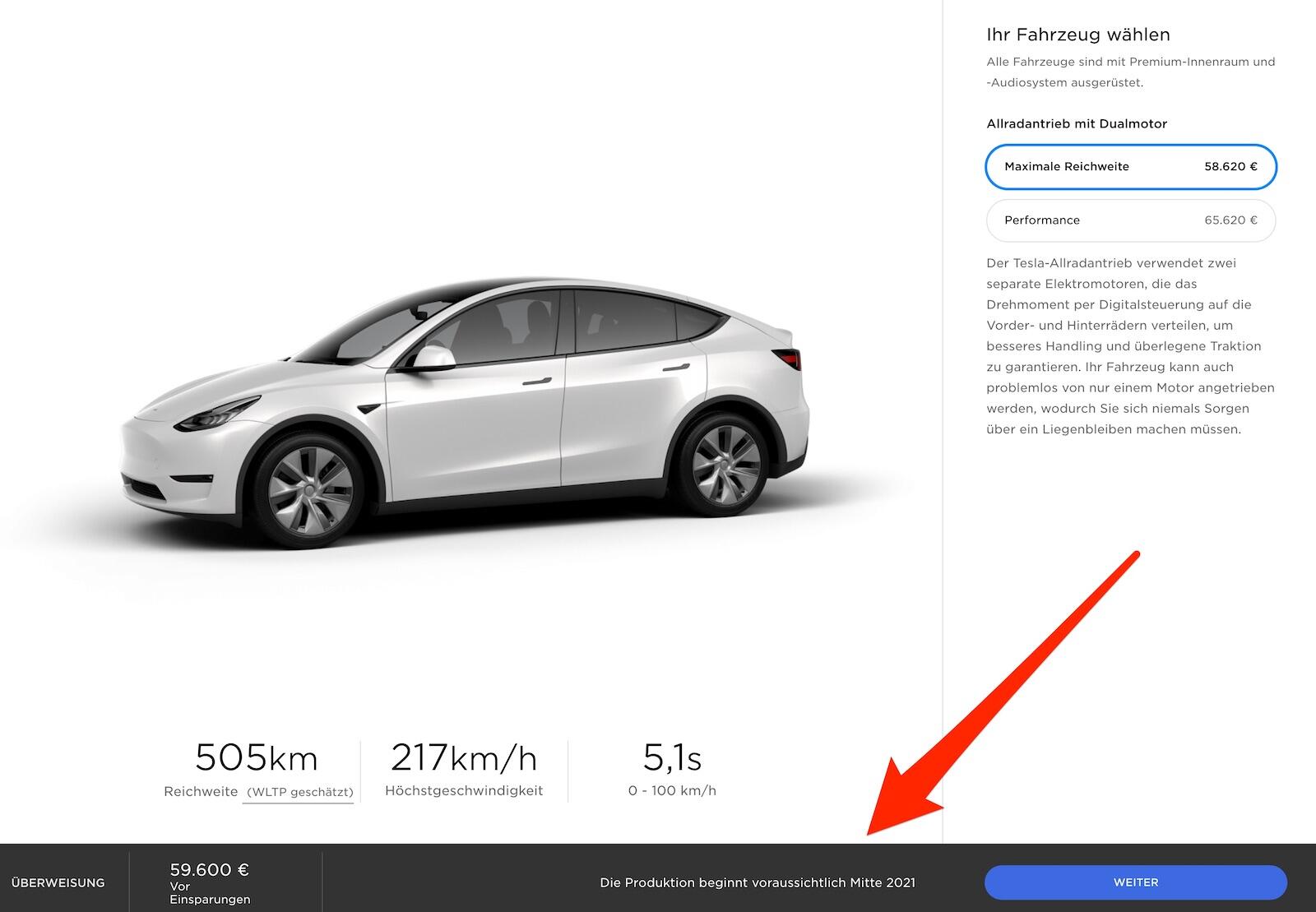 Bisher war auch gerne von Anfang 2021 die Rede, aber wir alle wussten, dass das etwas arg zuversichtlich war. Das gilt übrigens bisher nur für die Version mit der maximalen Reichweite, bei der Performance-Version steht noch kein Hinweis. Das ist ungewöhnlich, denn Tesla startet eigentlich gerne mit der teureren Version.