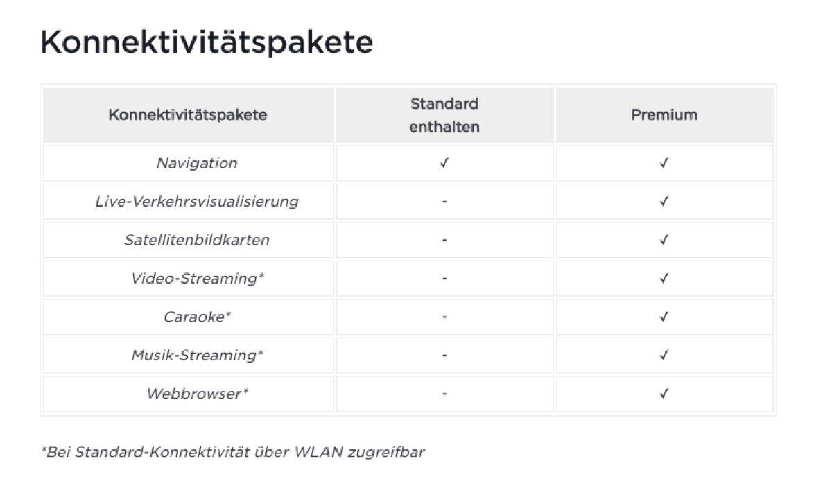 Auf dieser Webseite erklärt Tesla, was es beim Premium-Paket alles gibt und da man sowas wie Android Auto oder Apple CarPlay nicht anbietet, werden da sicher einige die 9,99 Euro im Monat bezahlen. Das gilt übrigens laut Tesla für alle Kunden, die ihr Auto nach dem 1. Juli 2018 gekauft haben.