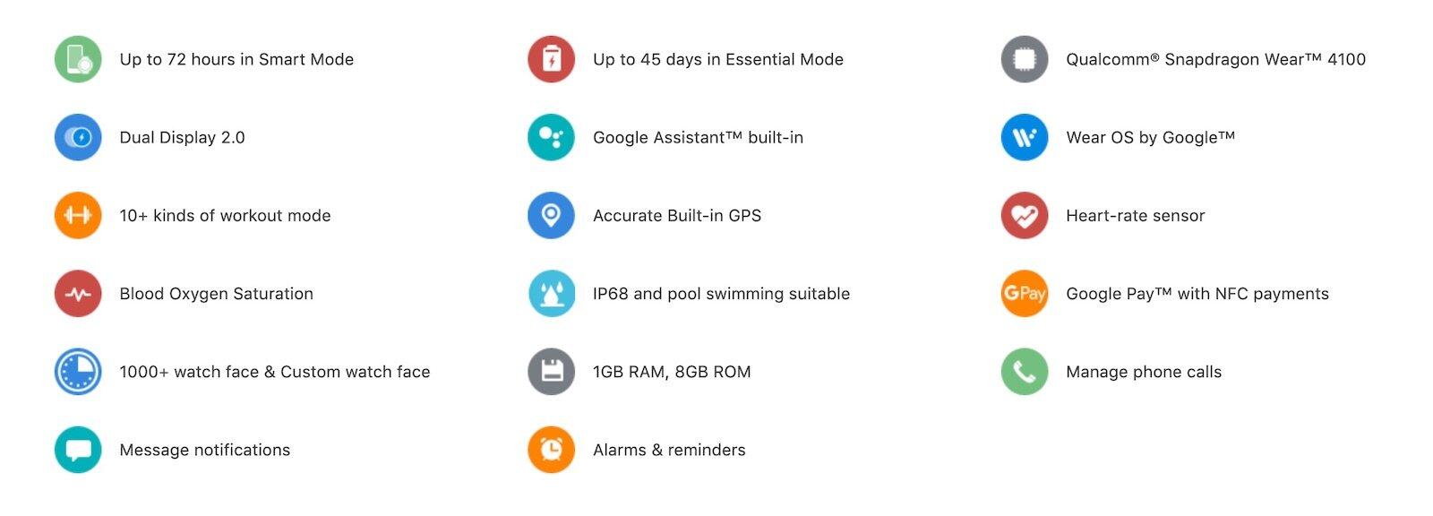 Was hat die TicWatch 3 Pro noch zu bieten? Ein rundes OLED-Display mit 454 x 454 Pixel, 1 GB RAM, 8 GB Speicher, es gibt NFC und die üblichen Sensoren für Fitness und Co., nur ein EKG-Sensor fehlt und LTE ist auch nicht vorhanden. Ich habe euch die Funktionen einfach mal als Übersicht eingebunden: