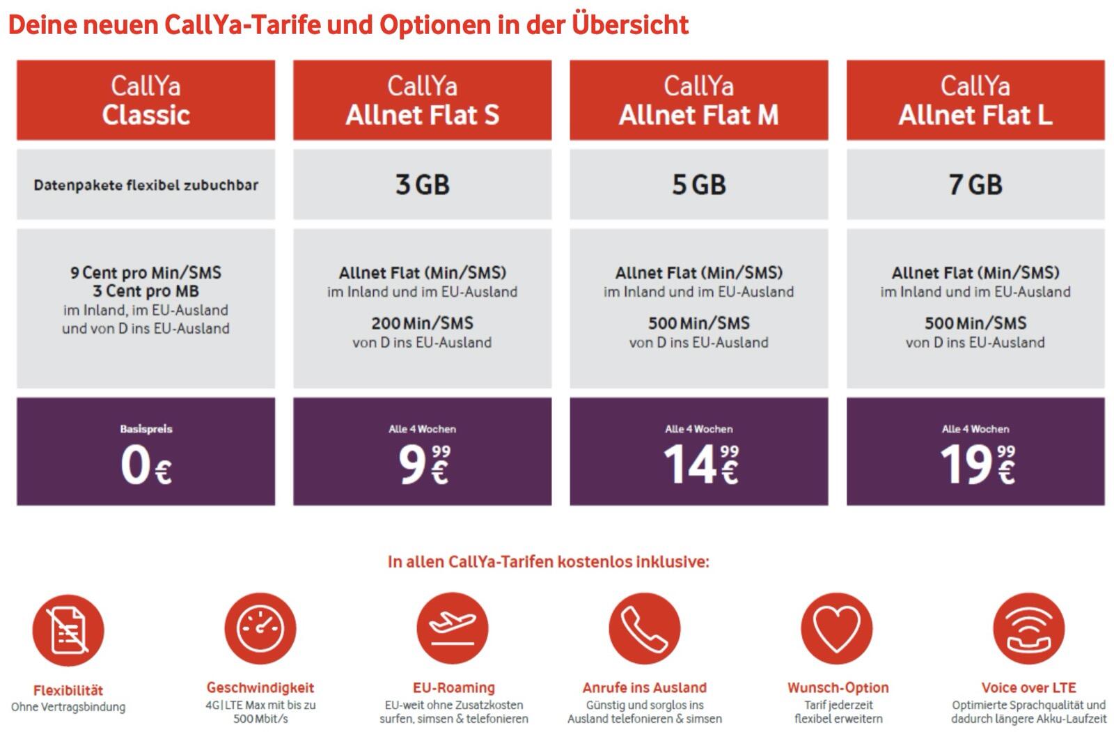 Der neue CallYa Allnet Flat M-Tarif hat 5 GB und neben der Allnet Flat insgesamt 500 Min/SMS ins EU-Ausland. Er kostet 14,99 € pro vier Wochen. Aus der CallYa Smartphone Allnet Flat wird zudem die CallYa Allnet Flat L mit insgesamt 7 GB für 19,99 € pro vier Wochen.