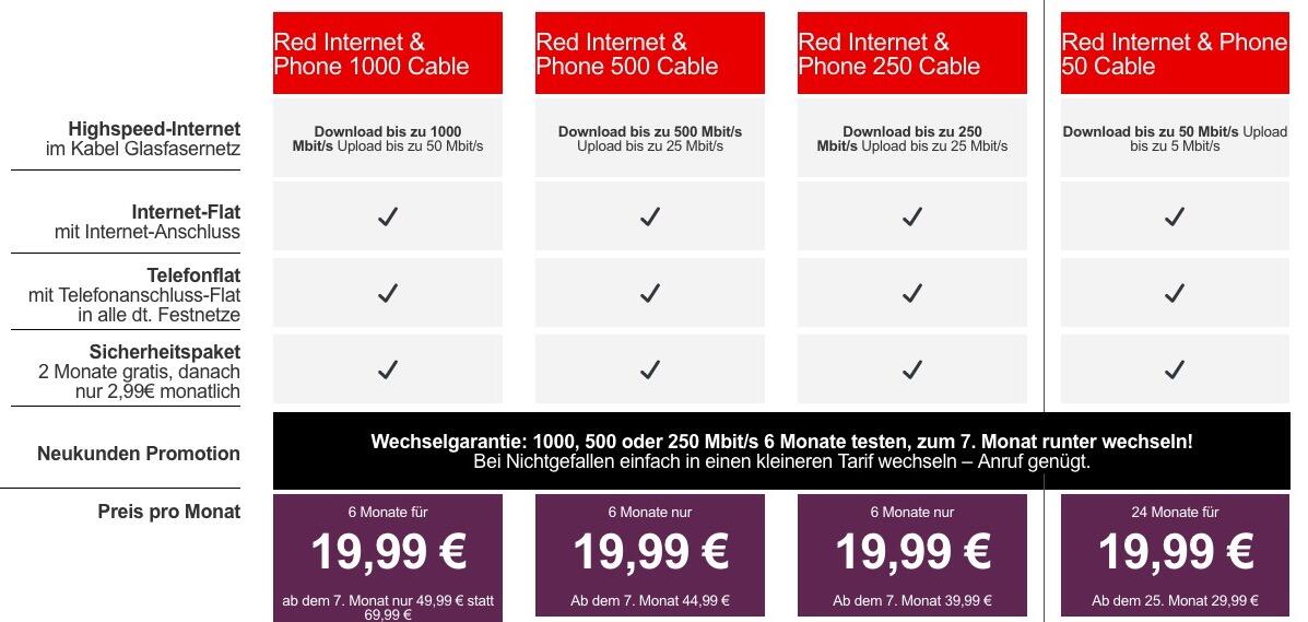 Die neuen Tarife gehen von Red Internet & Phone 1000 Cable bis Red Internet & Phone 50 Cable. Bis auf Red Internet & Phone 50 Cable kosten alle Tarife in den ersten sechs Monaten 19,99 Euro und werden danach teurer. Im 1000er-Tarif werden danach 49,99 Euro fällig, im 500er-Tarif 44,99 Euro und im 250er-Tarif 39,99 Euro.