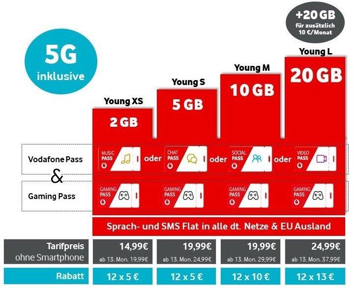 Vodafone hat heute die neuen Young-Tarife offiziell gestartet. Diese umfassen vier Mobilfunktarife von monatlich 19,99 Euro (mit zwei Gigabyte Datenvolumen) bis 37,99 Euro (mit 20 Gigabyte).