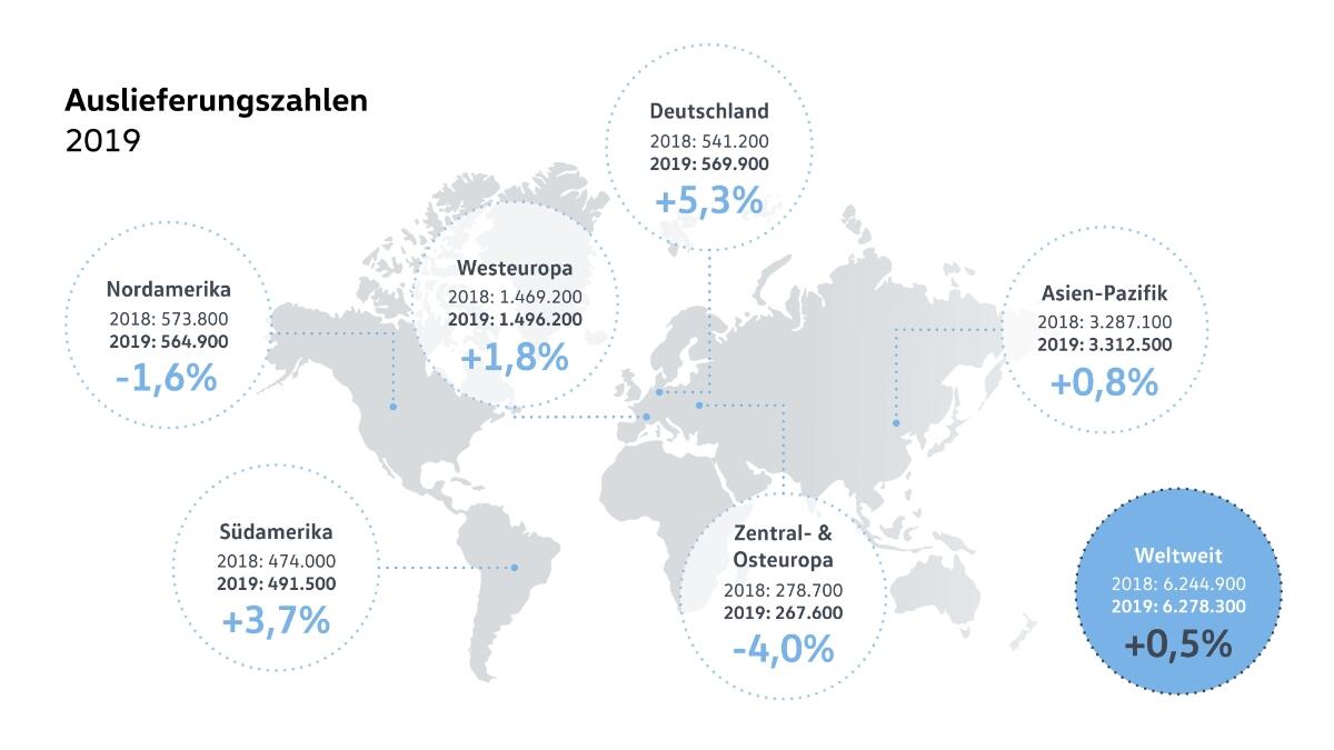 In Nordamerika und Zentral- und Osteuropa musste Volkswagen vergangenes Jahr ein Minus hinnehmen, in den restlichen Märkten konnte man aber wachsen und in Deutschland war das Wachstum mit über 5 Prozent sogar am größten.