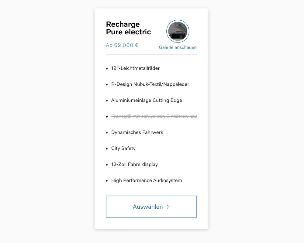 Der rein elektrische Volvo XC40 kommt mit Dual-Motor, einer vorne und einer hinten. Ich habe eben mal aus Spaß einen XC40 konfiguriert und mit gut 65.000 Euro ist man dabei, wenn man auf Sonderwünsche verzichten kann und die gängigen Systeme für Einparken und Co. haben möchte. Nicht gerade ein Schnäppchen.