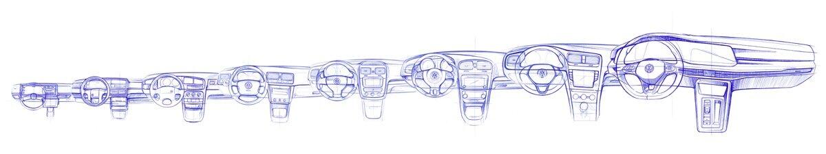 Volkswagen hat heute auch noch zwei Skizzen veröffentlicht, welche die Entwicklung vom Golf zeigen, einmal bei der Front und dann beim Interieur.