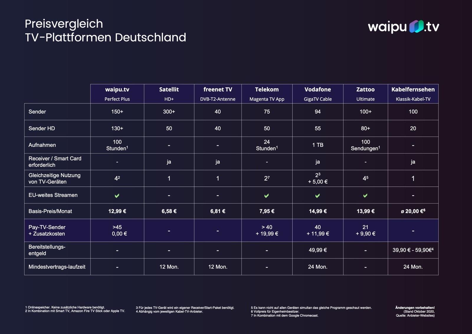 Das „neue“ Perfect Plus-Paket von waipu.tv vereint Free-TV, Pay-TV und Videos auf Abruf. Bis zum 31. Dezember 2020 erhalten Kunden das neue Paket-Bundle mit über 100 Free-TV-Sendern in HD, 46 Pay-TV-Sendern und über 10.000 Inhalten auf Abruf zum Einführungspreis von 9,99 Euro im Monat, anschließend kostet es 12,99 Euro monatlich. Das Paket wird also bei mehr Leistung auch teurer.