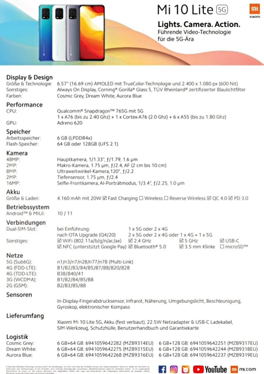 Einen Preis haben wir weiterhin nicht, aber Roland Quandt hat nun das komplette Datenblatt vom Xiaomi Mi 10 Lite veröffentlicht. Ein paar Dinge, wie Displaygröße oder Prozessor, kannten wir bereits. Wir wissen auch, dass man dem Modell das 5G-Modem spendiert hat, daher wird der Preis interessant sein.