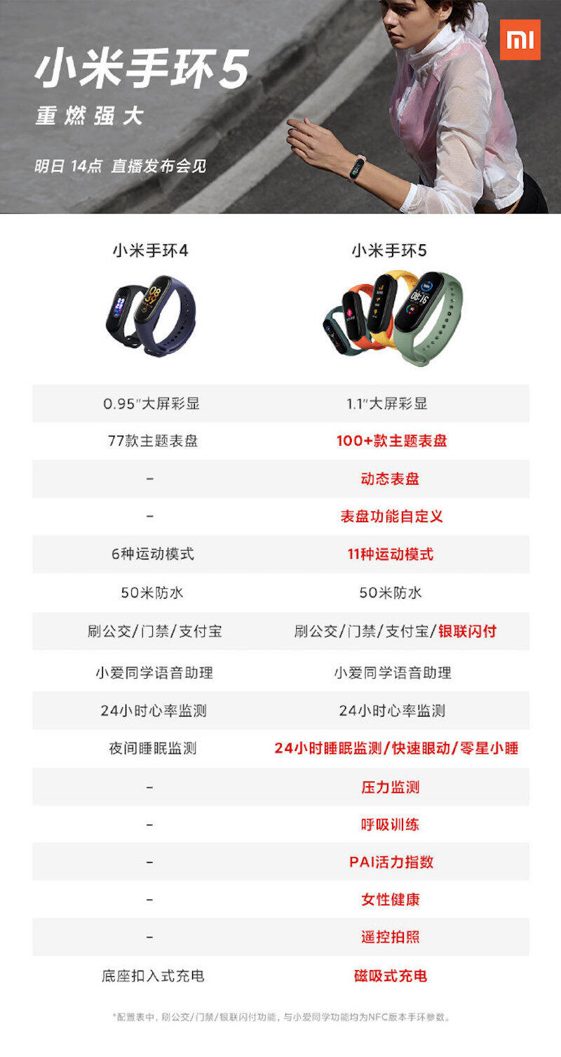 Das Xiaomi Mi Band 5 besitzt ein 1,1 Zoll großes OLED-Display, beim Mi Band 4 waren es 0,95 Zoll. In China gibt es nun 100 statt 77 Zifferblätter, es gibt 11 statt 6 Sportmodi und der Schlaf wird jetzt 24 Stunden am Tag und nicht nur in der Nacht überwacht (zum Beispiel bei einem Mittagsschlaf oder Powernap).