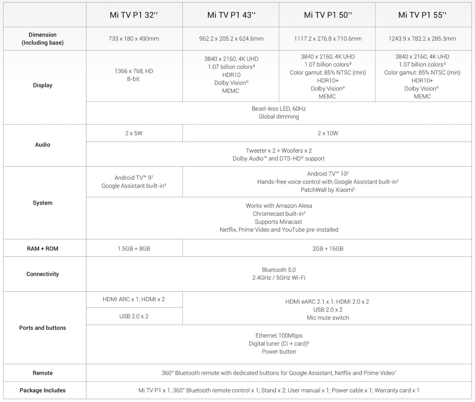 Xiaomi Mi TV P1-Reihe Spezifikationen