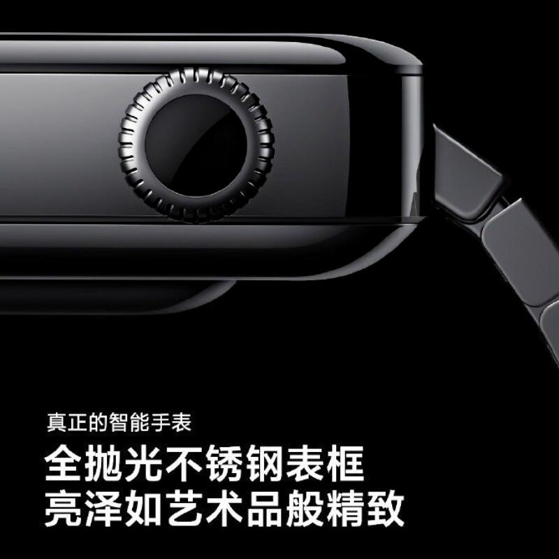Das zweite Bild zeigt eine Detailaufnahme der Seite mit der Krone, welche man so bei der Apple Watch ebenfalls findet. Wenn mir das Google Translate richtig übersetzt hat, dann bewirbt Xiaomi hier eine Lünette aus Edelstahl. Da die Xiaomi Mi Watch aber keine „Lünette“ besitzt, muss ich etwas spekulieren.