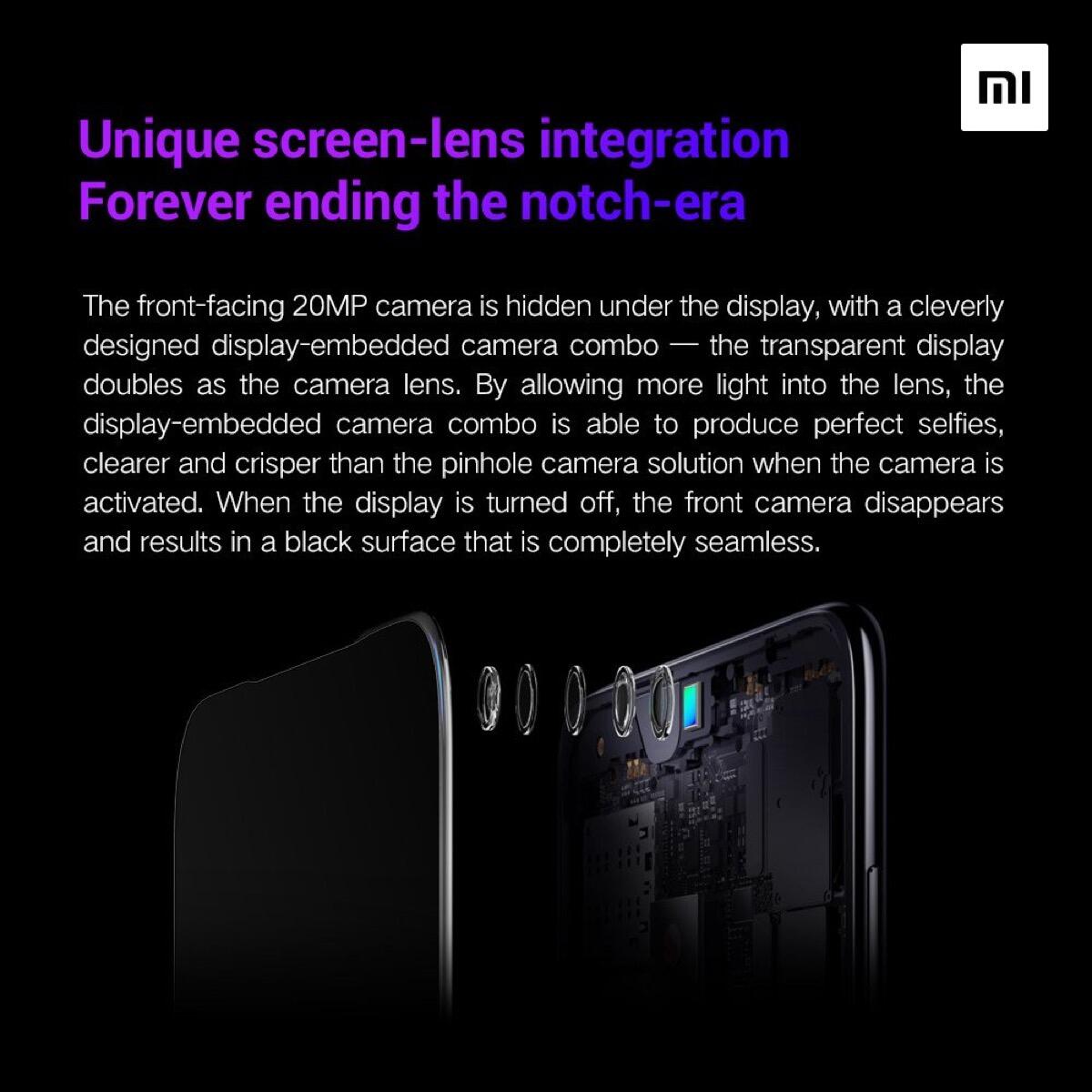 Der Bereich im Display agiert gleichzeitig als Kameralinse. Während Xiaomi von klaren und guten Selfies spricht, so gab Oppo übrigens gestern an, dass die Qualität mit dieser Lösung etwas leidet und die Ergebnisse nicht so gut wie mit einer normalen Frontkamera in einer Notch oder einem Loch sein werden.