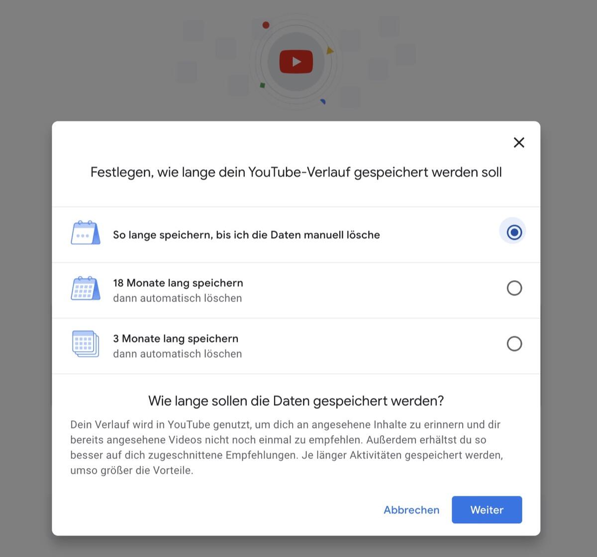 Nun führt das Unternehmen dieses Feature auch für den YouTube-Verlauf ein. Das Prinzip ist dasselbe wie beim Standortverlauf und den Web- und App-Aktivitäten: Der Nutzer entscheidet, wie lange sein YouTube-Verlauf gespeichert werden soll. Die Auswahl liegt dabei wieder bei „Bis zum Löschen“, 3 oder 18 Monaten.