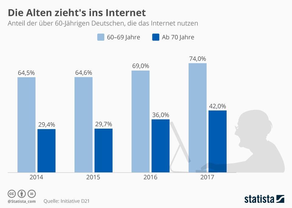 So stieg der Anteil der Internetnutzer bei den 60 bis 69-Jährigen von 64,5 auf 74 Prozent und bei den ab 70-Jährigen von 29,4 auf 42 Prozent. Das ist ein beachtliches Wachstum von 14,7 bzw. 42,9 Prozent.