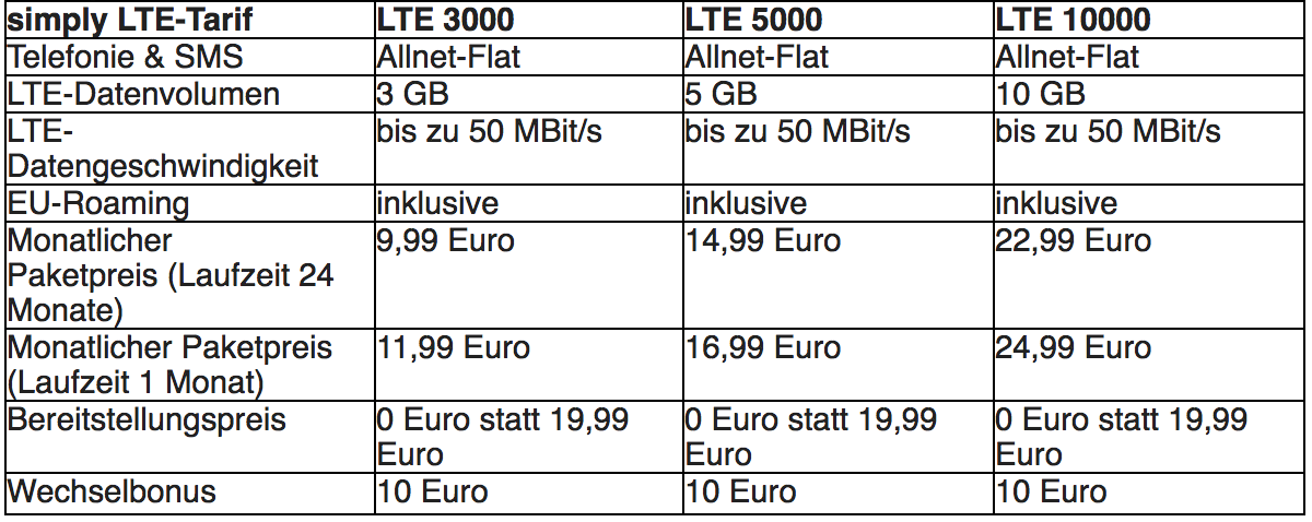 Der Bereitstellungspreis beträgt vorübergehend bei allen Tarifen 0,00 Euro statt 19,99 Euro. Neukunden, die mit ihrer Rufnummer vom bisherigen Anbieter zu simply wechseln, erhalten zudem 10 Euro Wechselbonus.