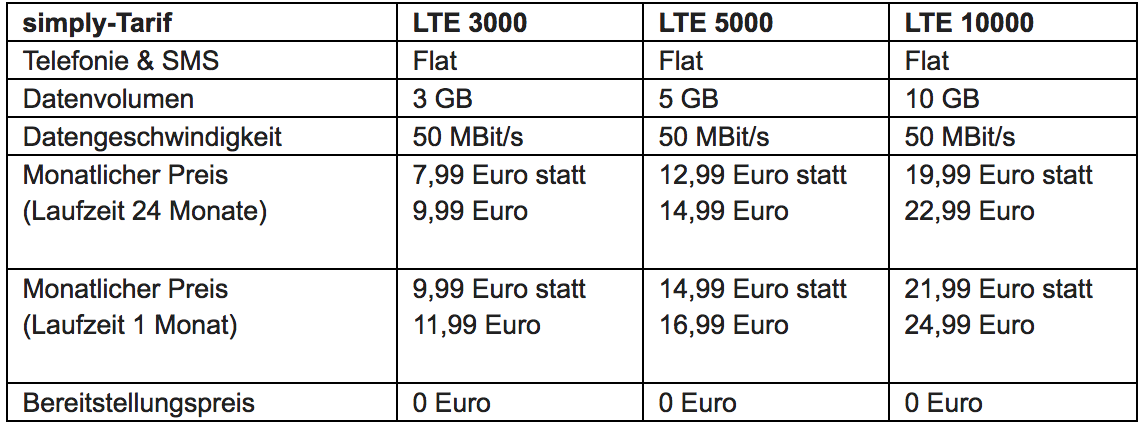 Der simply-Tarif LTE 3000 mit 3 GB LTE-Datenvolumen ist jetzt für 7,99 Euro statt 9,99 Euro monatlich verfügbar, was einer Preissenkung von 20 Prozent entspricht. Beim LTE 5000 reduziert sich der Preis von 14,99 Euro auf 12,99 Euro pro Monat. Hier sind 5 GB Internetvolumen inbegriffen.