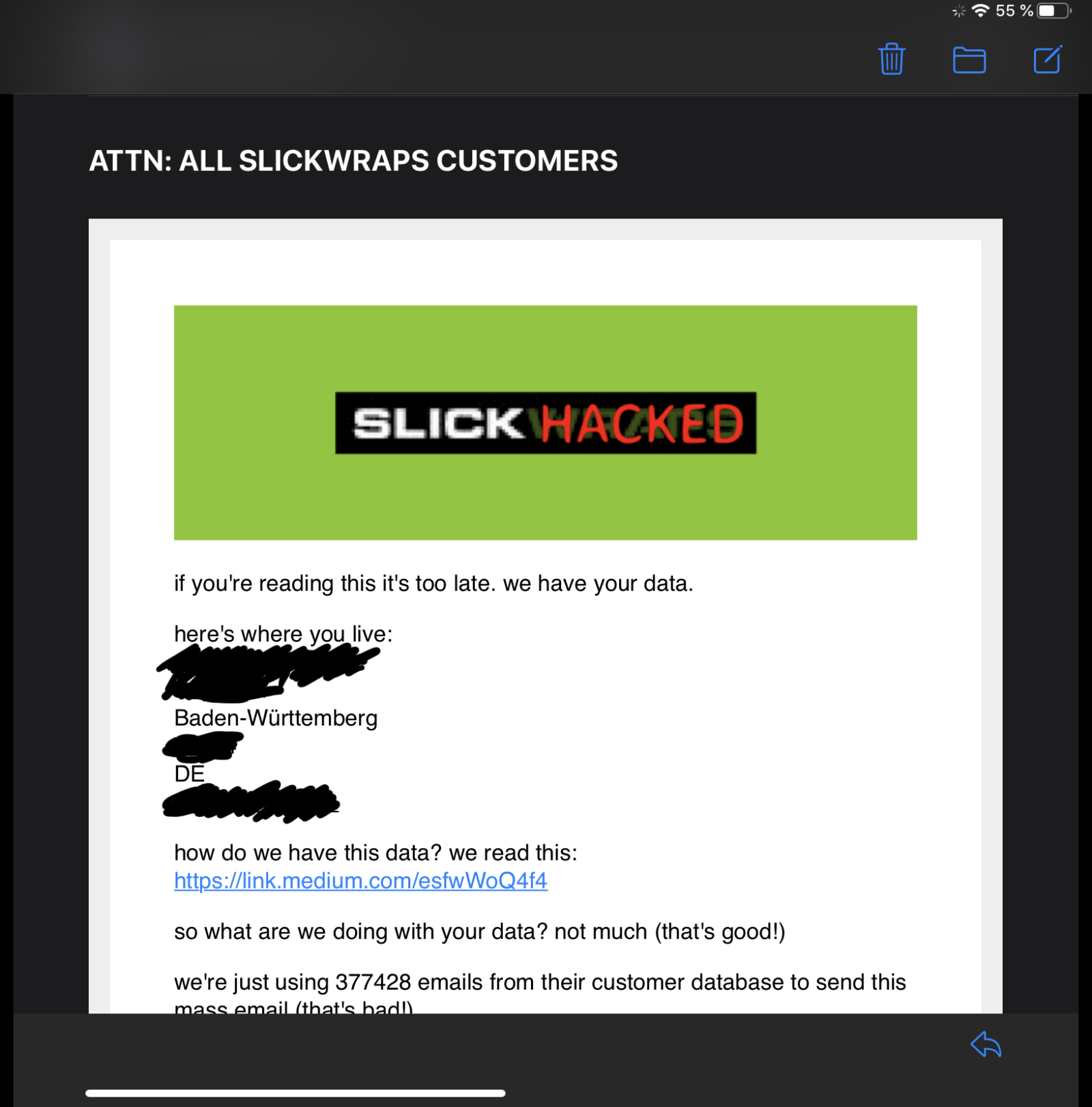 Weil Slickwraps nichts dagegen unternommen hatte, wurden zwischenzeitlich an über 300.000 Accounts aus der Slickwraps-Datenbank die folgende Mail geschickt: