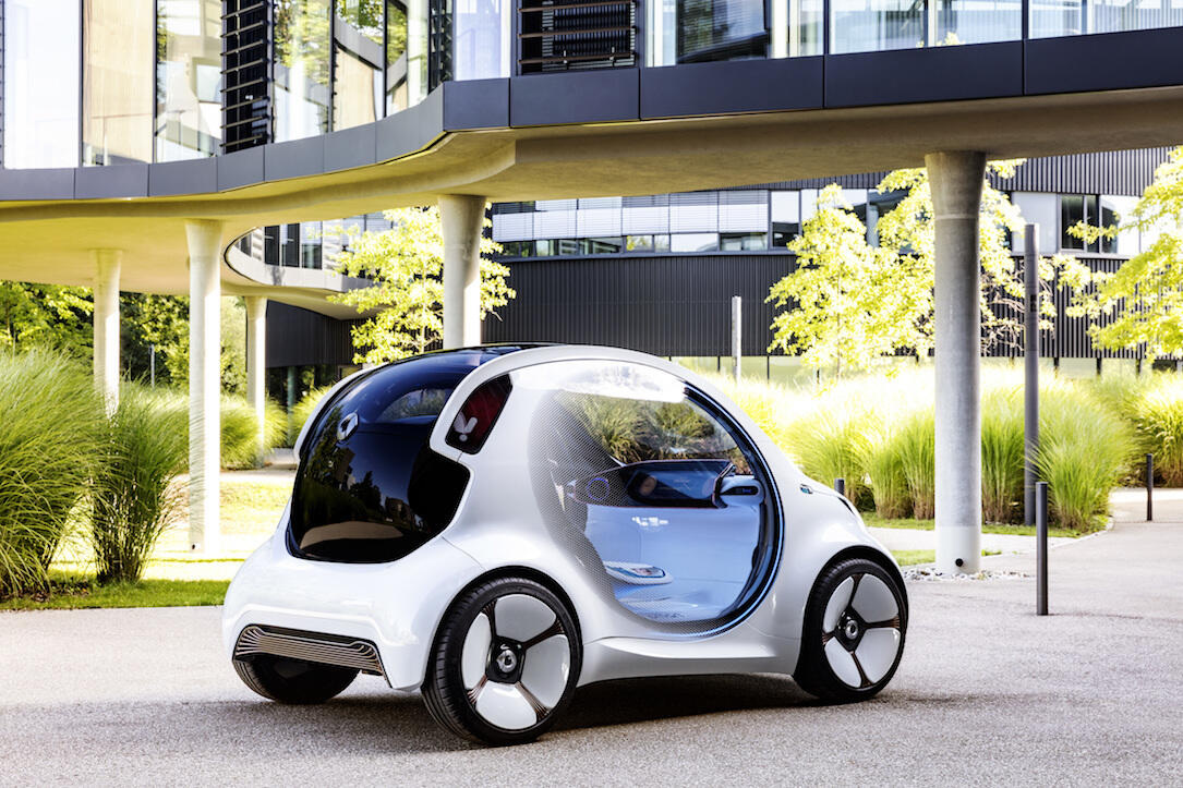 Vier Themen werden die Zukunft der Automobilbranche laut Daimler in den nächsten Jahren massiv verändern: Vernetzte Autos, autonome Autos, elektrische Autos und Sharing-Möglichkeiten. Alle Bereiche hat man in dem Konzeptauto Smart vision EQ fortwo vereint. Es ist ein elektrisches Auto, welches autonom Personen befördert, mit anderen Autos kommuniziert und über einen Dienst geordert wird.