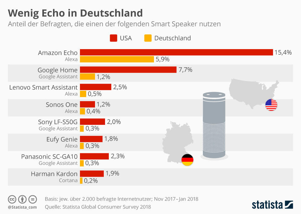 Eine aktuelle Umfrage zeigt, dass der Echo in Deutschland dominiert. Und wenn es kein Echo ist, dann kommt oft ein anderes Modell mit Alexa zum Einsatz. Einziger Konkurrent derzeit: Google mit dem Google Assistant und Google Home.