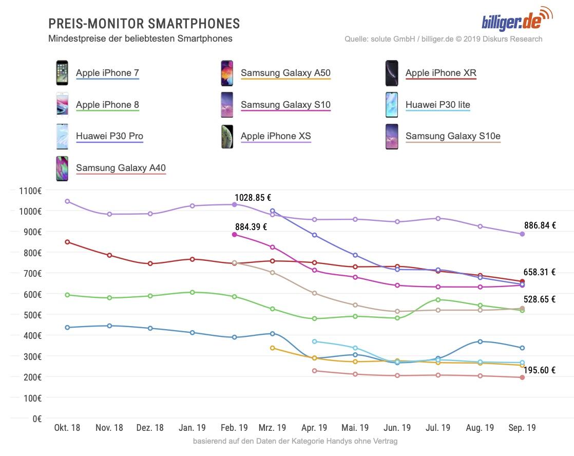 Beim Hersteller Samsung stechen die Geräte Samsung Galaxy A50 für rund 254 Euro und Samsung Galaxy A40 für rund 196 Euro hervor. Sie sind trotz gutem Funktionsumfang weitaus günstiger als nahezu alle anderen beliebten Smartphones. Bei beiden Geräten bleibt der Preis aber auf einem grundsätzlich stabilen Niveau.