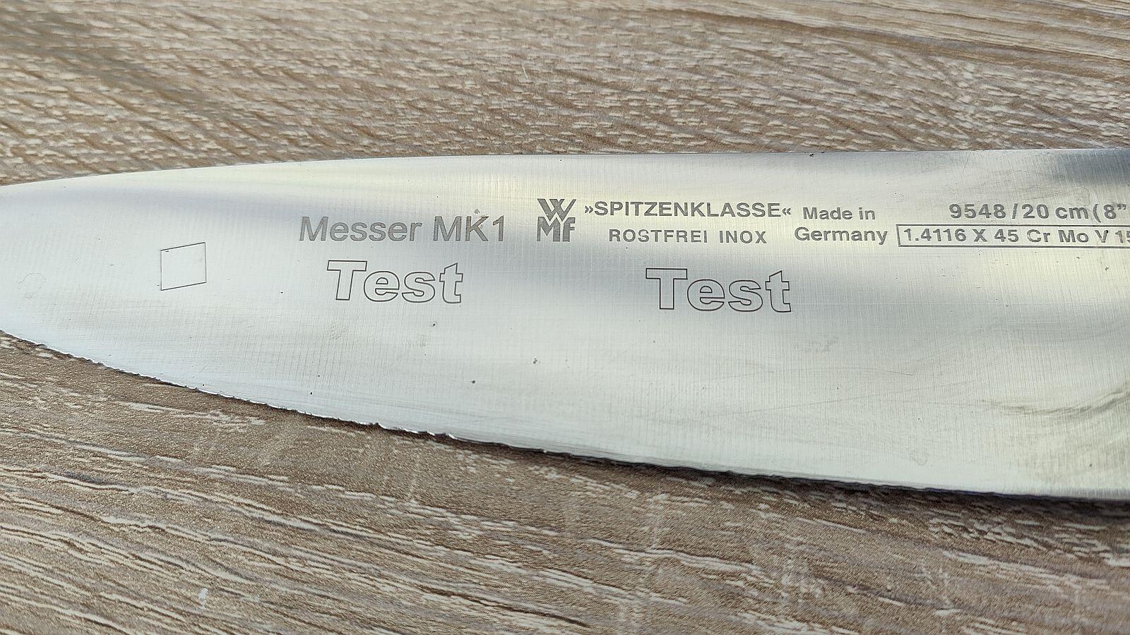 Was natürlich auch nicht fehlen durfte, war die Markierung/Gravur in Metall. Zumindest versuchen wollte ich es! Also wieder fix mein Steinaltes Küchenmesser rausgekramt und mit schwarzem Kreidestift (funktioniert wie ein Edding, aber bequem mit Wasser abwaschbar!) ein paar Flächen angemalt und was soll ich sagen? Der Laser hat so tief reingebrutzelt, dass man mit dem Finger deutlich spüren kann und ich nicht mehr sagen würde, dass das nur eine Markierung, sondern schon eher eine Gravur ist!