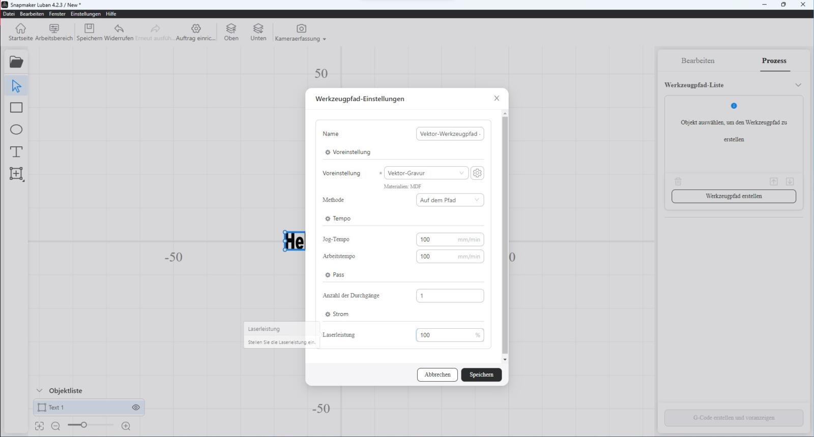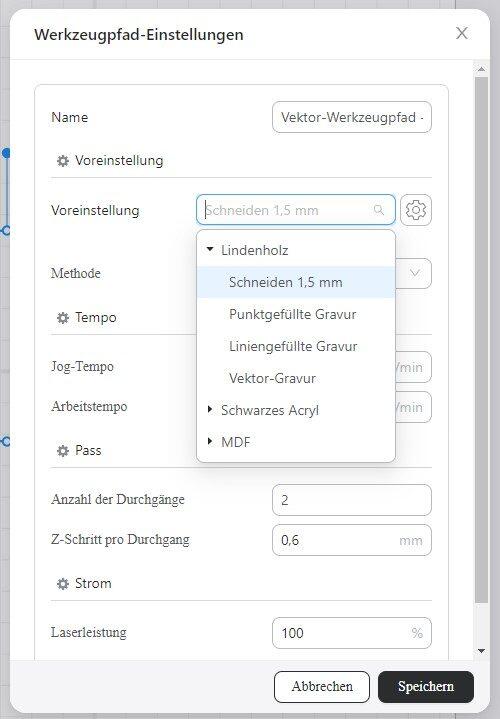 In der Bibliothek von Luban sind passend zum verwendeten Laserkopf schon ein paar Materialien und die dazu passenden Einstellungen gespeichert. Alle anderen Materialien müssen dann selbst erst einmal ausprobiert und manuell eingestellt werden.