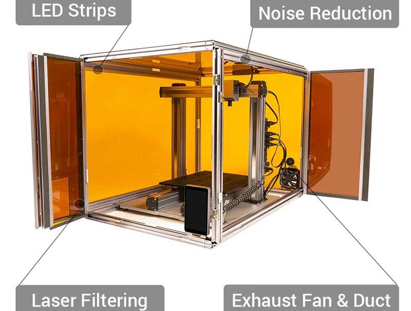 Dazu kommen die hochwertigen Aluprofile, im Gehäuse verbaute Kontaktschalter, welche den Drucker anhalten, wenn die Tür geöffnet wird, ein Abluftventilator ist verbaut, ein Schlauch für die Abluft ist ebenso dabei und auch noch an eine LED-Beleuchtung wurde gedacht. Alles selbstverständlich über den Touchscreen des Druckers steuerbar! Der Preis für das Gehäuse ist in meinen Augen also absolut vertretbar.
