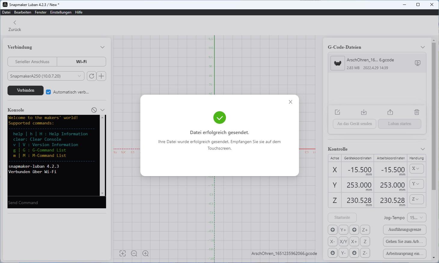 Die Kommunikation kann wahlweise per USB-Kabel oder auch via WLAN stattfinden. Natürlich kann das geslicete Objekt auch auf einen USB-Stick gepackt und händisch zum Drucker transferiert werden. Über WLAN kann die Datei entweder zum Gerätespeicher übertragen oder direkt kommunizierend via WLAN gedruckt werden. Der WLAN-Transfer sieht dann beispielsweise so aus: