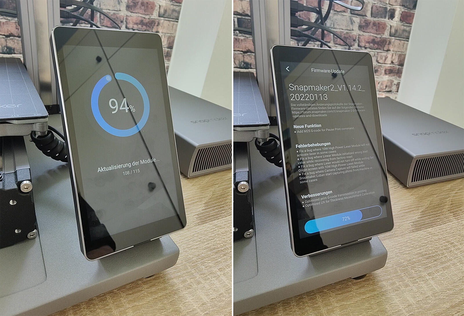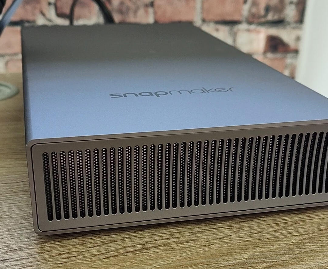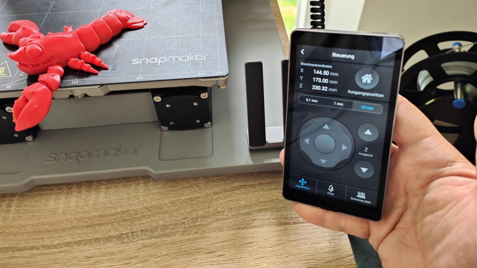 Auf dem oberen Foto sieht man links teilweise noch den Anycubic Kobra, den ich ebenfalls gerade teste. Preislich natürlich ein heftiger Unterschied, aber man sieht auch beispielsweise die quer verlaufende Z-Achse mit dem Druckkopf, welche im Vergleich mit der Z-Achse des Snapmakers gerade zu brüchig/filigran aussieht.