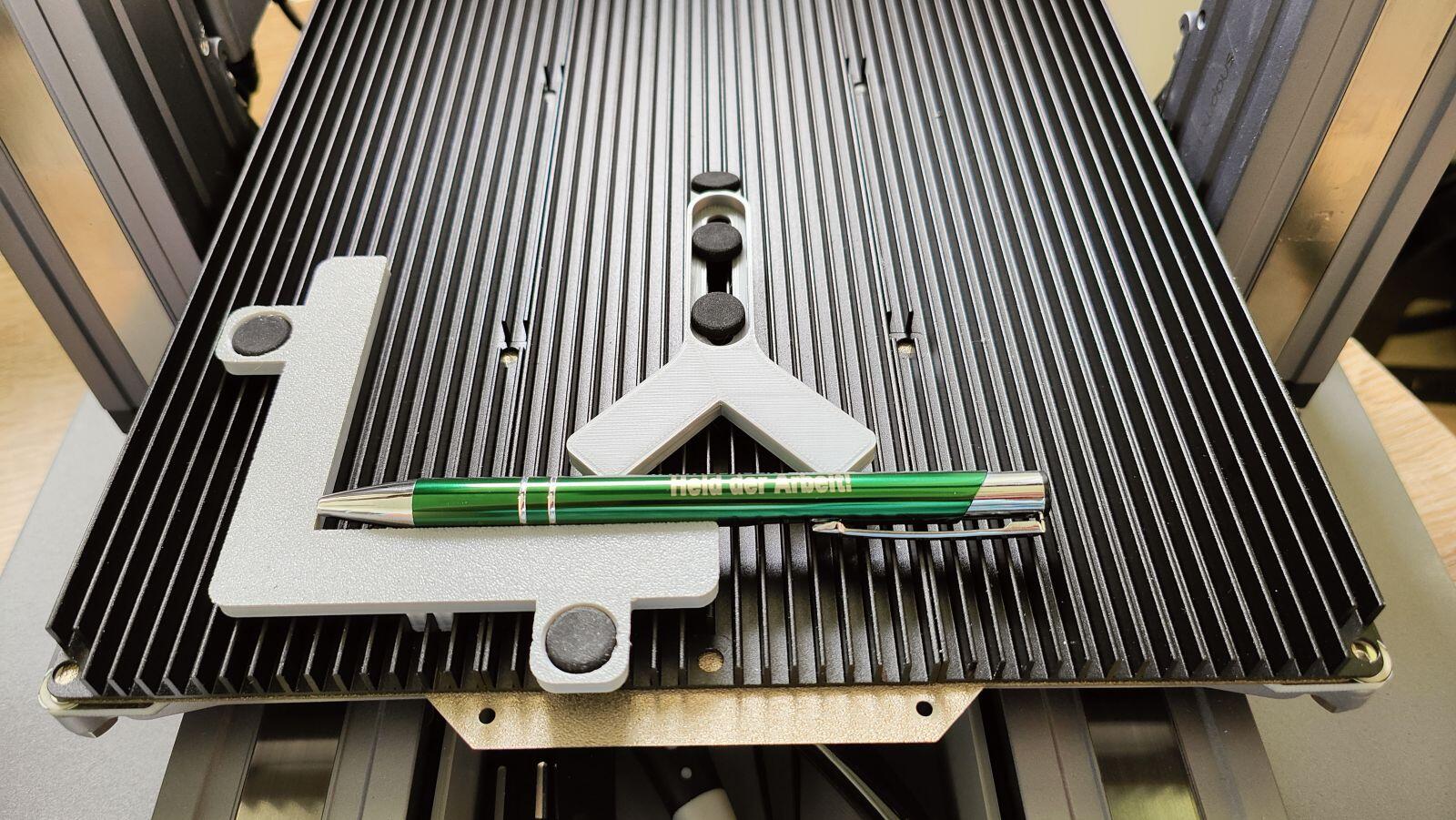 Nachdem das Heizbett auch magnetisch ist, kann ich nun die orig. Druckplatte einfach abnehmen und die PEI-Platte mit aufgeklebter Laser-Unterlage magnetisch aufsetzen. Fertig. Wieso ist das nicht von Haus aus so umgesetzt?