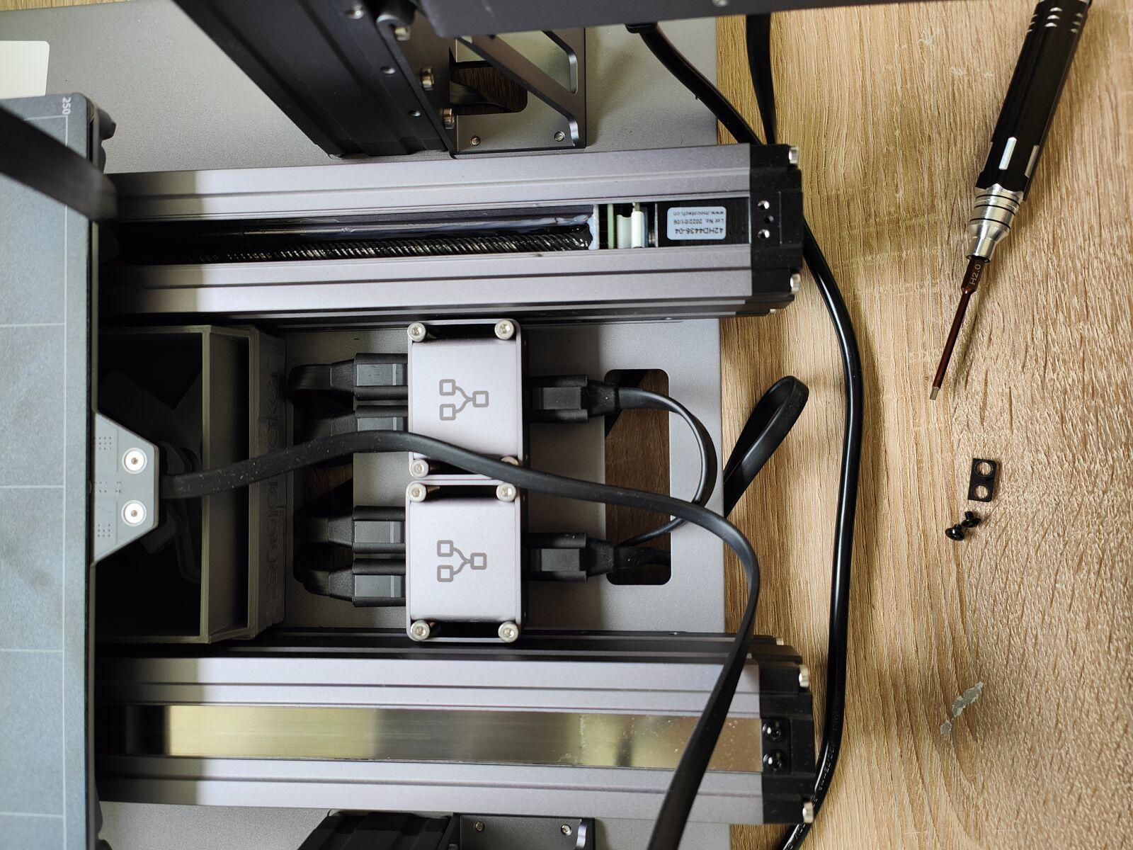 Das bedeutet dann in diesem Fall 14 Schrauben rausdrehen, Laserplatten (Unterlage zum lasern) reinlegen und mit 10 Schrauben wieder festziehen. Dazu kommen noch weitere 4 Schrauben, die den alten Druckkopf lösen und noch einmal wieder 4 Schrauben reindrehen, um auf den Laserkopf zu wechseln.