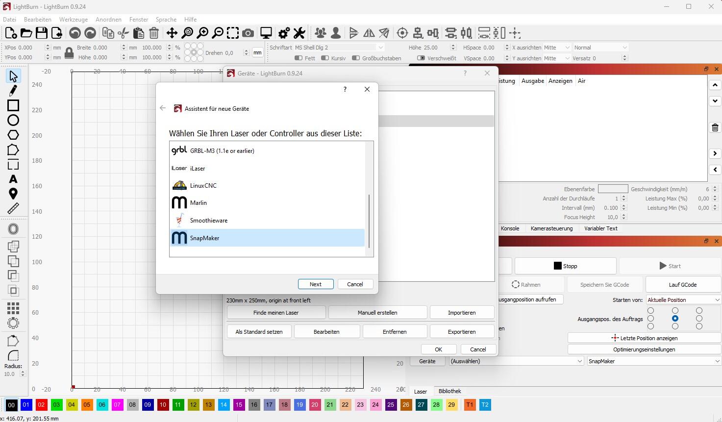 Testweise habe ich auch Lightburn mal eingerichtet, um es mit dem Snapmaker nutzen zu können. Das funktioniert von Werk aus, indem man einfach ein Gerät hinzufügt und dann den Snapmaker auswählt. Dann noch die Maße der Arbeitsfläche einstellen und man kann schon anfangen.
