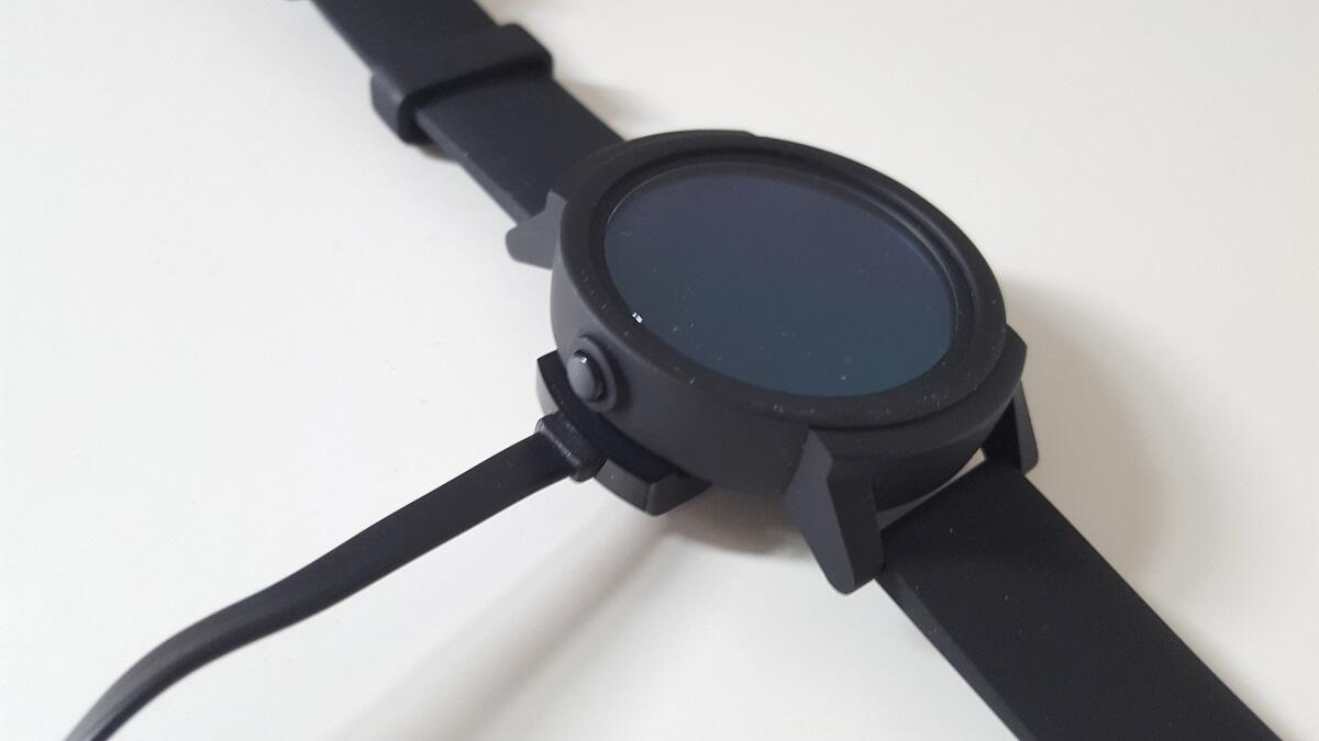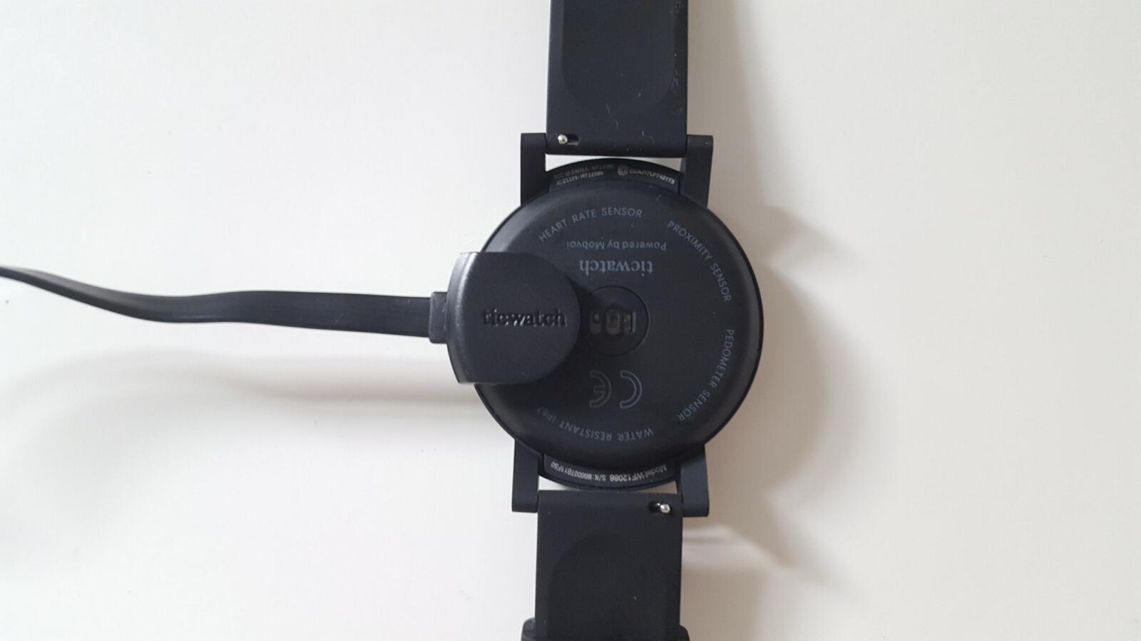 Die Ticwatch lässt sich sehr leicht in Betrieb nehmen. Zunächst einmal muss der Akku in der Uhr natürlich aufgeladen werden. Hierzu legt Mobvoi ein 75,3cm langes Kabel bei, an dessen Ende sich eine kleine magnetische Platte mit metallenen Ladepins befindet. Aufgrund des geringen Preises ist natürlich keine induktive Lademöglichkeit verbaut, was ich aber auch ehrlich gesagt nicht schlimm finde.