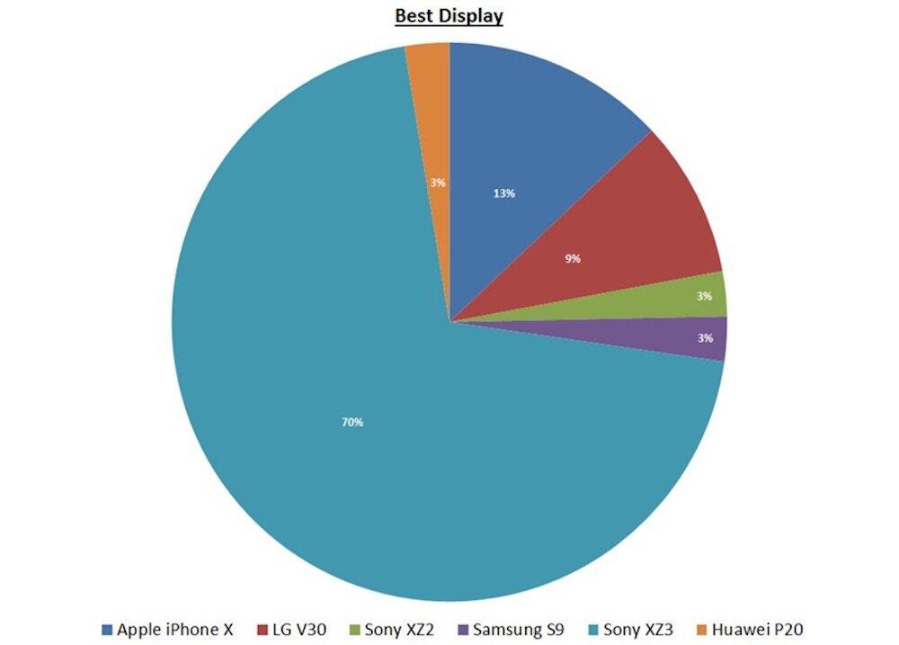 Es gab noch weitere Fragen wie die nach der besten Helligkeit, dem besten Kontrast und den realistischsten Farben. Ich erspare euch die Grafiken, das XZ3 ist bei allen Kategorien haushoch der Gewinner. Nur bei den realistischen Farben schneidet man nicht ganz so gut ab (45 Prozent). Sonst liegt man immer bei 50+ Prozent.