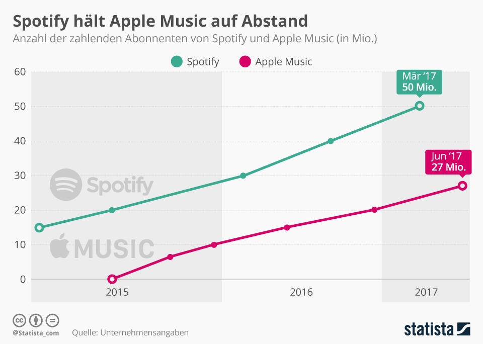 Spotify gelingt es, den mächtigen Konkurrenten Apple auf Abstand zu halten, zuletzt konnte dieser sogar vergrößert werden. Zum Zeitpunkt des Starts von Apple Music im Juni 2015 hatte Spotify rund 20 Millionen zahlende Kunden. Wie die nachfolgende Grafik zeigt, ist dieser Abstand seitdem relativ konstant geblieben.
