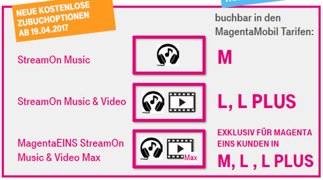 Zuletzt wurde unter Berufung auf Insiderkreise berichtet, dass die Telekom am 19. April ein Feature namens StreamOn bereitstellen wird, das von zahlreichen Kunden kostenlos gebucht werden können soll. Ein mal aktiv, nimmt es Inhalte seiner Partner vom Datenvolumen des Vertrags aus. Privatkunden sollen das Feature ohne Aufpreis erhalten. StreamOn ist dabei in verschiedene Stufen gestaffelt.