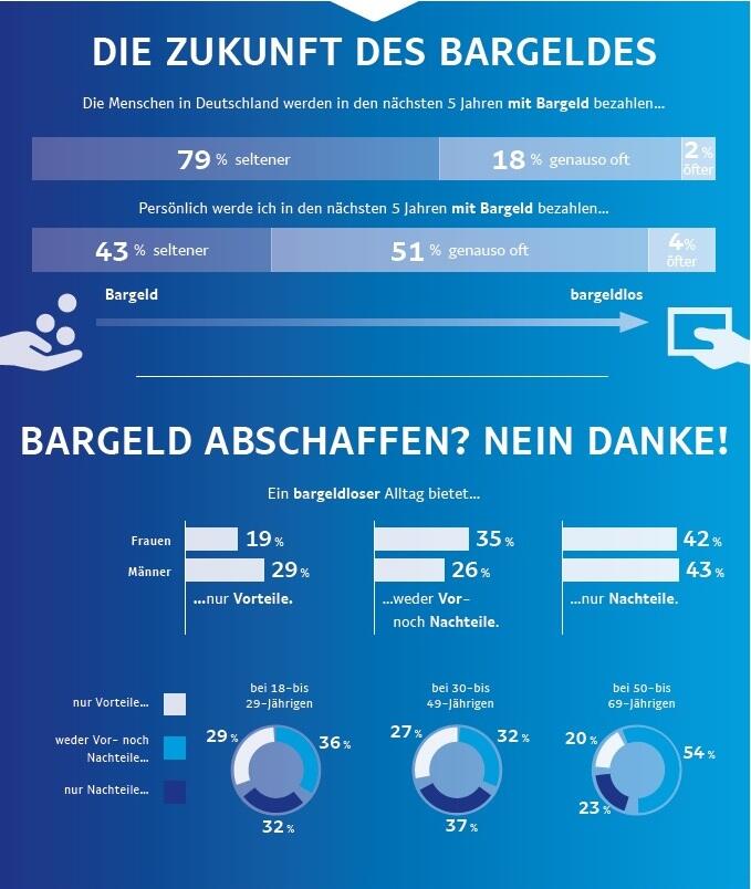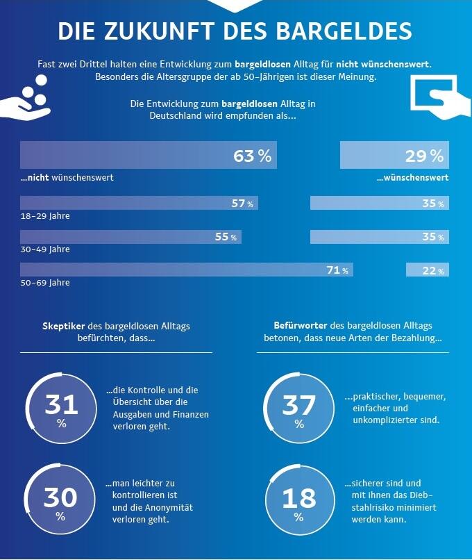 Entsprechend halten fast zwei Drittel eine Entwicklung zum bargeldlosen Alltag nicht für wünschenswert. Besonders in der Altersgruppe ab 50 Jahren ist diese Meinung mit über 70 Prozent stark verbreitet.