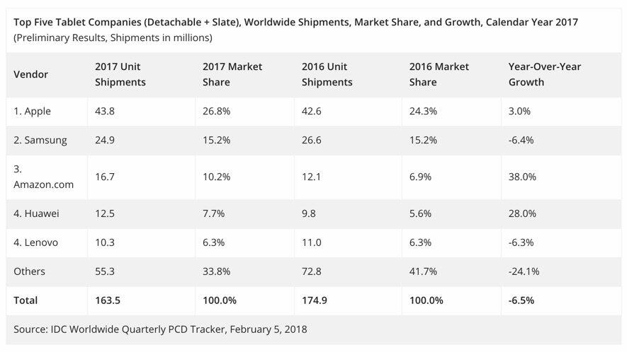 In Q4 2017 waren es 7,7 Millionen Amazon-Tablets und ein Wachstum von über 50 Prozent im Vergleich zum Vorjahrjahresquartal. Man hat damit Samsung von Platz 2 abgelöst. Mit Blick auf das Jahr liegt Samsung allerdings noch vor Amazon.