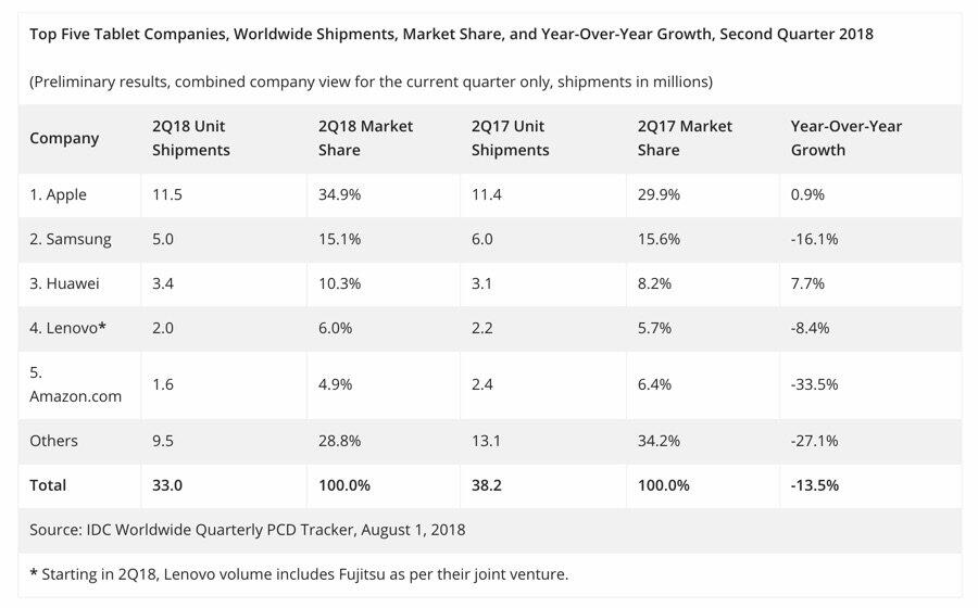 Der Tablet-Markt ist im zweiten Quartal 2018 geschrumpft und alle Hersteller, von Apple und Huawei abgesehen, mussten ein paar Prozentpunkte abgeben.