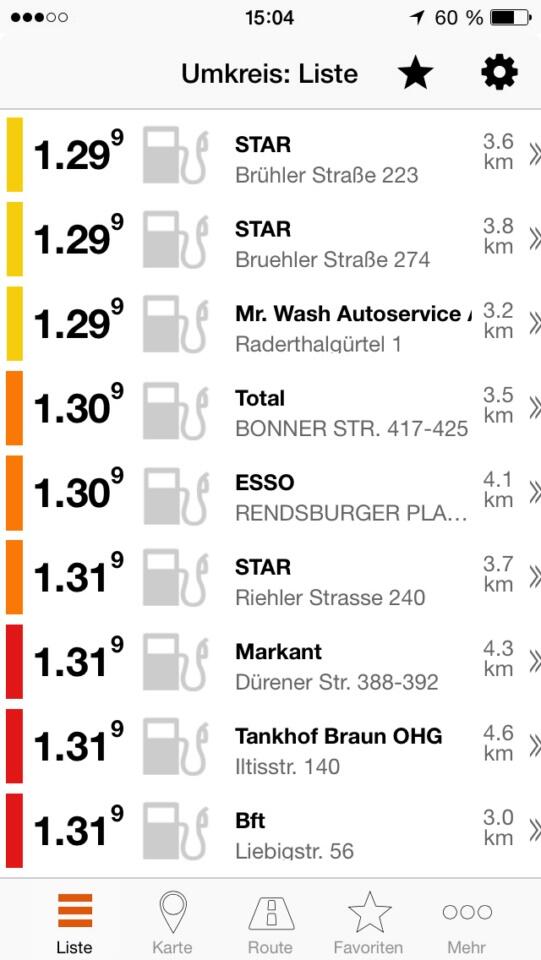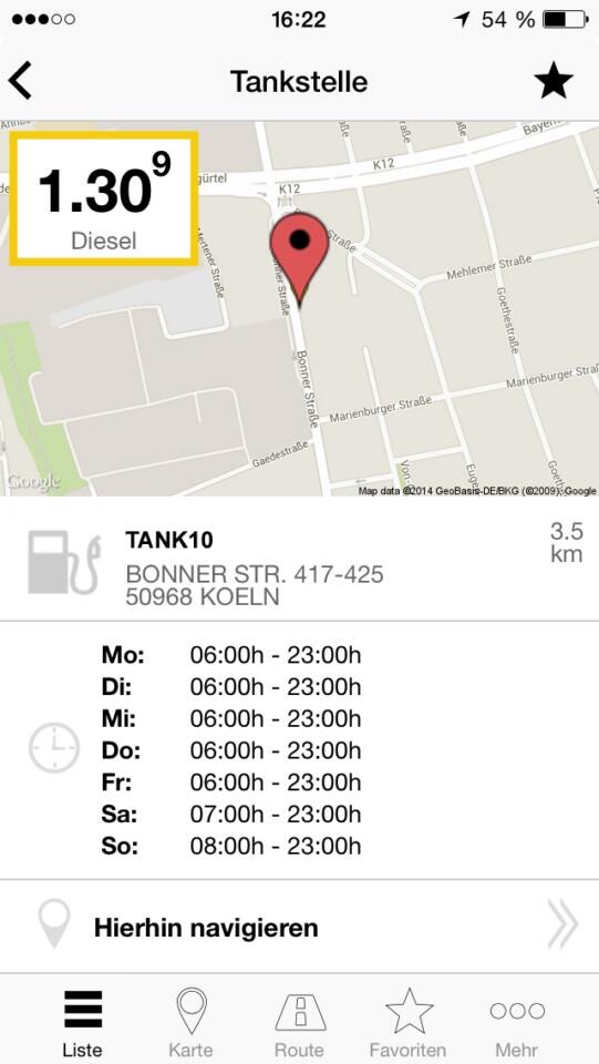 Die App stammt vom Team hinter „MeineStadt“ und bietet bekannte Funktionen in optisch ansprechender Hülle. Gesucht werden können die günstigsten Tankstellen in der Umgebung, es gibt eine Detailansicht mit Öffnungszeiten, Adresse sowie Preisinformationen und auch das Navigieren zur Tankstelle ist möglich. Auch Favoriten und Tankstellen-Infos entlang einer Route sind mit dem Programm nutzbar.
