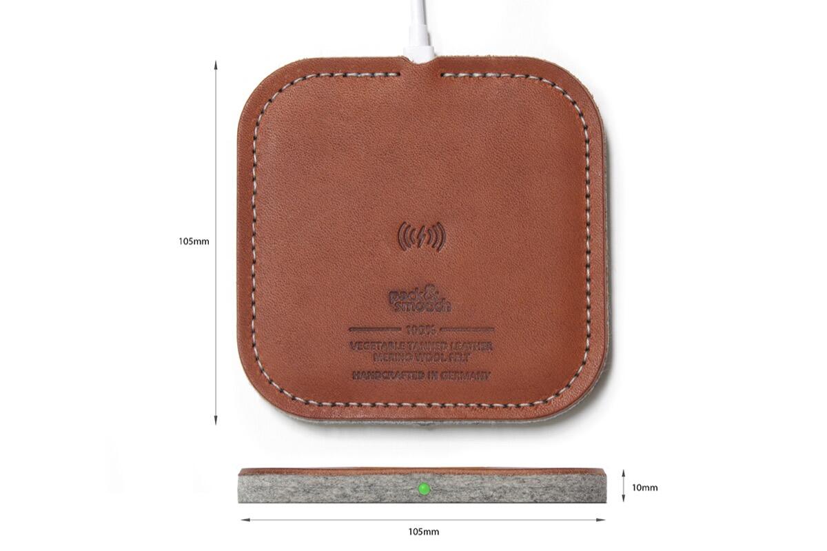 Der Qi-Lader kommt dabei wahlweise hellbraunem Leder mit grauer Unterseite bzw. dunkelbraunem Leder mit anthrazitfarbener Unterseite daher.