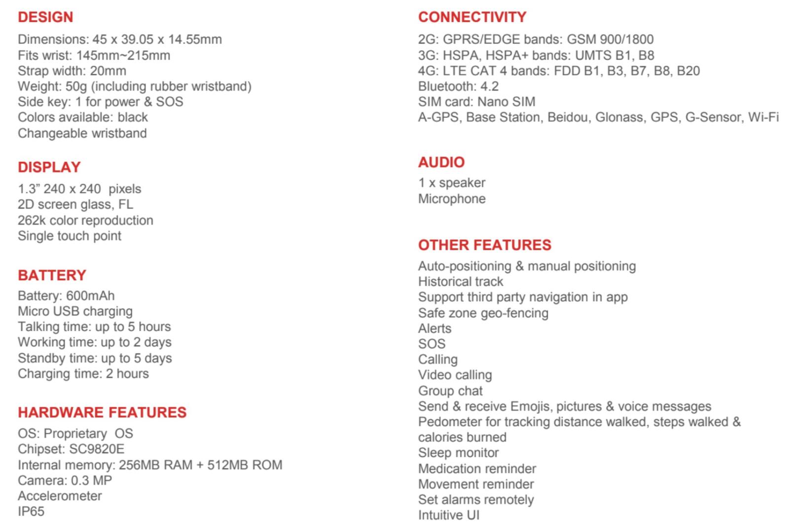 Die wichtigsten Spezifikationen findet ihr in der folgenden Grafik. 4G, 240×240 Pixel Display, 600mAh Akku, Lautsprecher, Mikrofon, Bluetooth 4.2, NanoSIM, A-GPS, uvm.