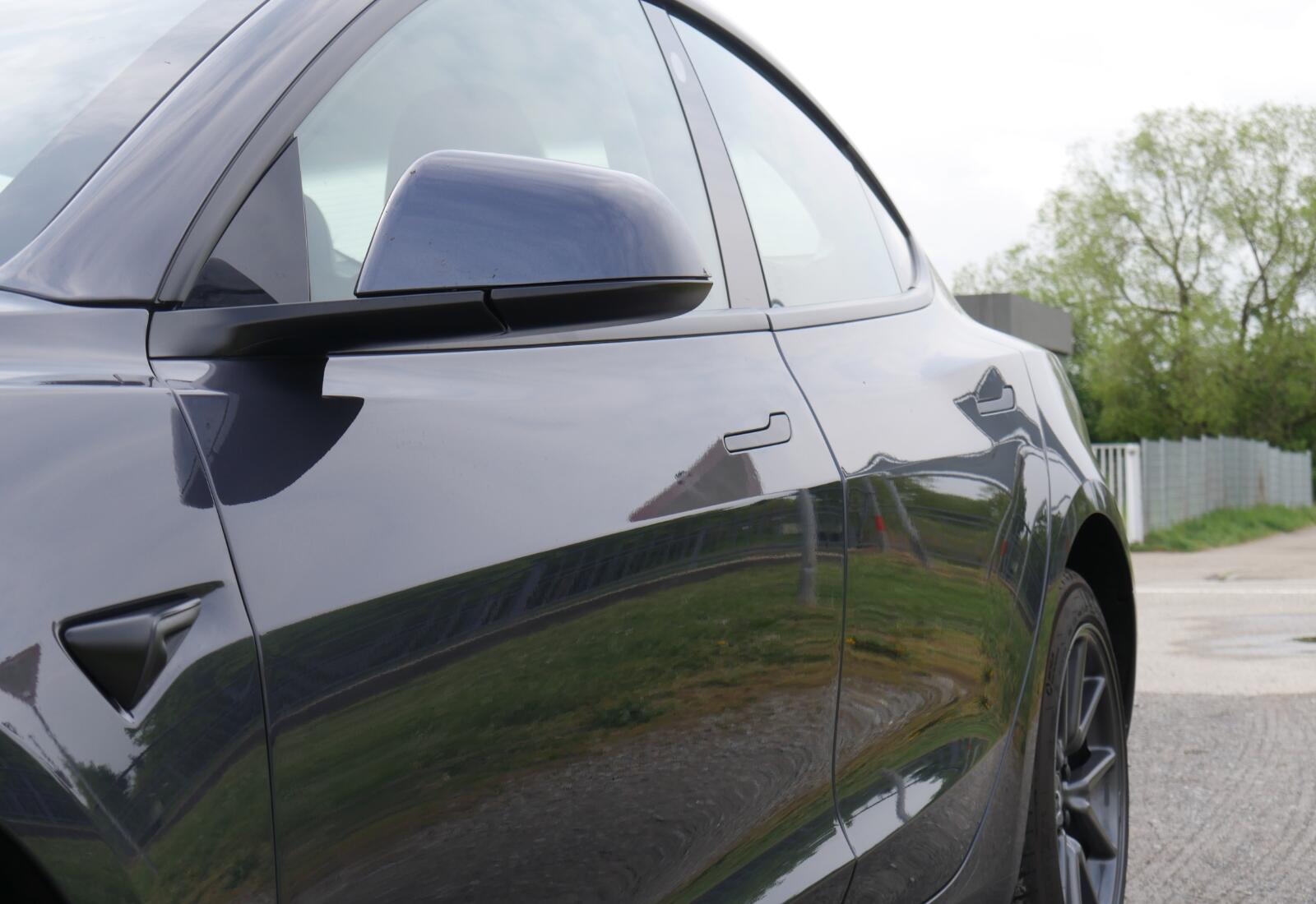 - Die Türgriffe sind versenkt und man muss gegen die eine Seite drücken, damit man sie greifen kann. Das reduziert den Luftwiederstand und sieht optisch gut aus. Allerdings sollte man das neuen Mitfahrern vorher erklären. Das gilt auch beim Aussteigen, denn es gibt keine klassischen Türgriffe, sondern einen Knopf, um die Tür zu öffnen.