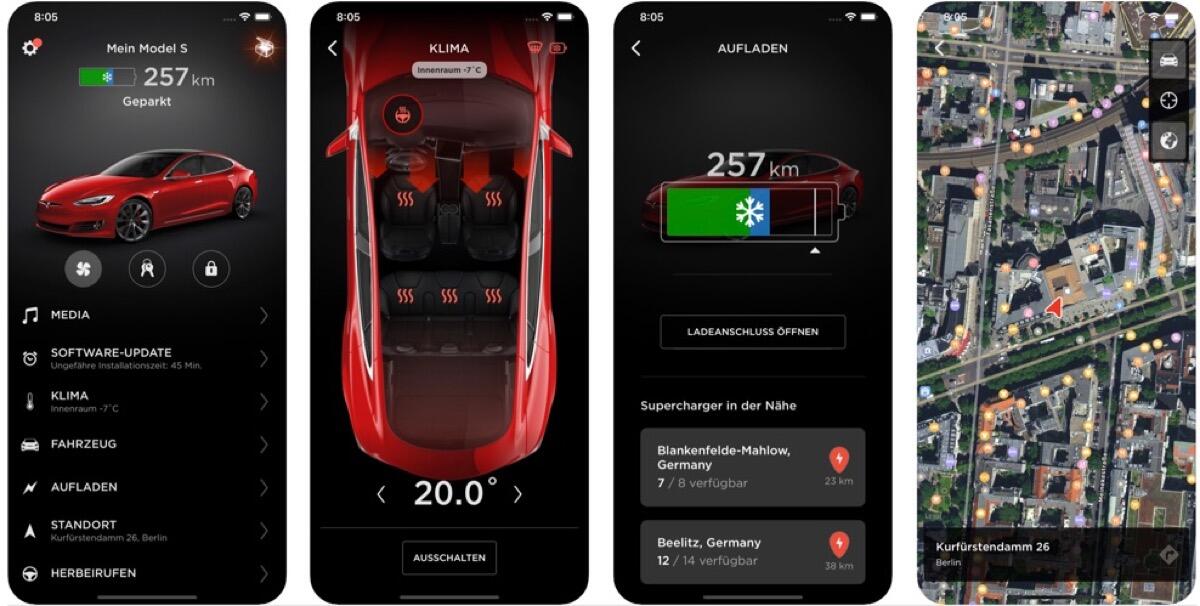 Außerdem kann man sehen, wie voll das Auto ist, wo der nächste Supercharger ist und einen Termin beim Servicecenter ausmachen. Der Kofferraum vorne und hinten lässt sich so ebenfalls öffnen und die Fenster kann man damit einen Spalt öffnen (zum Beispiel im Sommer, damit die Hitze aus dem Auto geht).