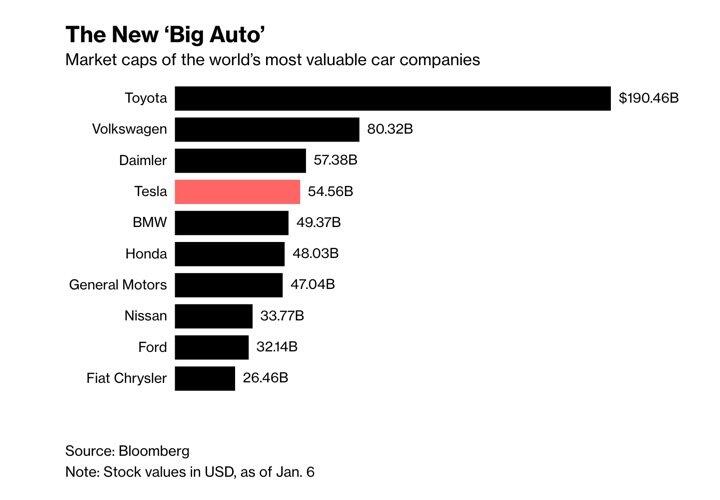 Beim Börsenwert hat Tesla bekannte Unternehmen wie BMW und Honda hinter sich gelassen und – je nachdem wie der Kurs gerade steht – ab und an auch Daimler. Volkswagen und Toyota sind aber immer noch weit entfernt.